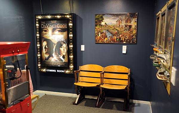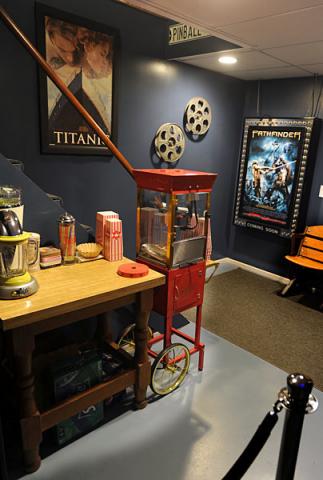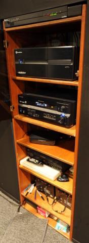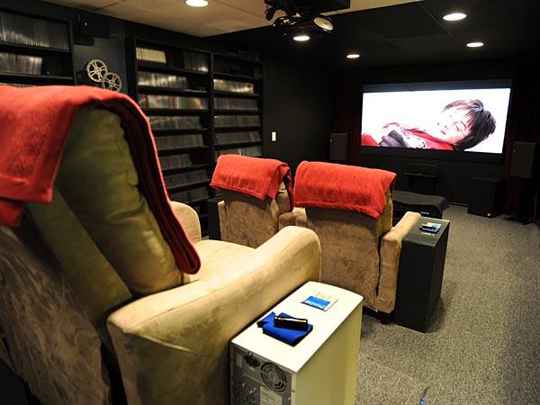 Below are a selection of images of my HTPC Theater. This is a small theater using the space of half my basement. The sound and video is optimized so that the best spot in the theater is the front row. The walls and ceiling are insulated with fiberglass bats, to reduce echoing. The front viewing area is painted black to reduce reflection and color tinting of the movie from the surrounding walls. Back row seats are raised stadium style, allowing an unobstructed view of the screen from those seats. Base shakers were added to the seating to enhance the theater experience. Shelves were built to hold DVD's and CD's (both movies and music can be enjoyed).